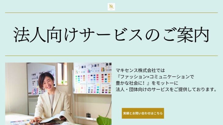 マキセンスでは「ファッション×コミュニケーションで豊かな社会に!」をモットーに、法人・経営者の方々のサポートサービスをご提供しています。 ご要望や開催規模に合わせた人材研修やイベント企画もご提 … 続きを読む 法人・経営者向けサービスのご案内