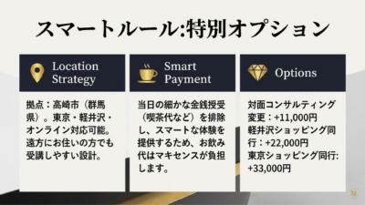 多忙な皆さまに、私と過ごす時間だけは、お財布を出したりお会計を気にしたりする「面倒」を手放していただくための「スマートルール」を設定しております。