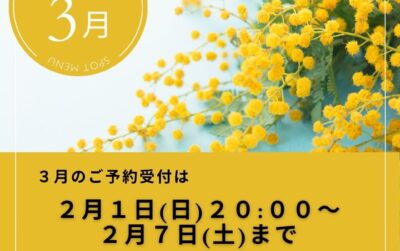 スポットメニューのご案内 【3月ご予約可能日】3月開催のご予約可能日をアップしました! 2026年1月24日(土)NEW !